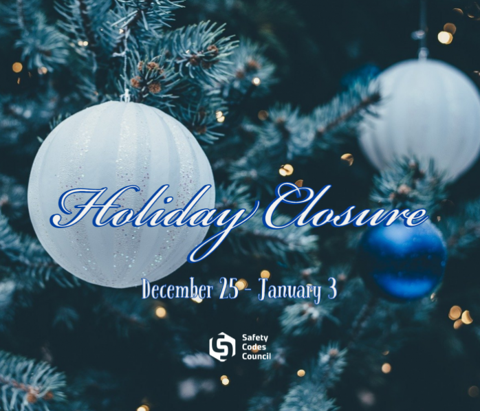 The Safety Codes Council will be closed for the holidays starting Friday, December 25. We will reopen on January 4, 2021, though our physical location will remain closed to the public.